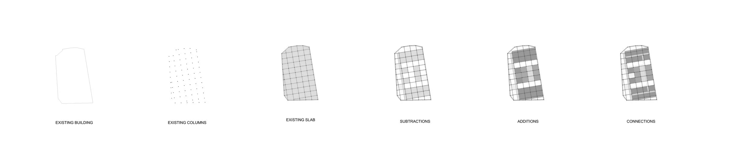 Subtraction: involves taking away the redundant building elements and reducing it to its core components of column and beams. It is also creates voids in the existing floor plates to provide natural light into the deep plan.